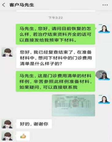 理赔专员会根据案件情况与您联系,提醒您注意事项及协助提交完整理赔材料(包括不限于:人伤照片、病历、诊断证明、医疗发票原件等);微信1V1专人全程协助,身故伤残案件启动绿色理赔通道。